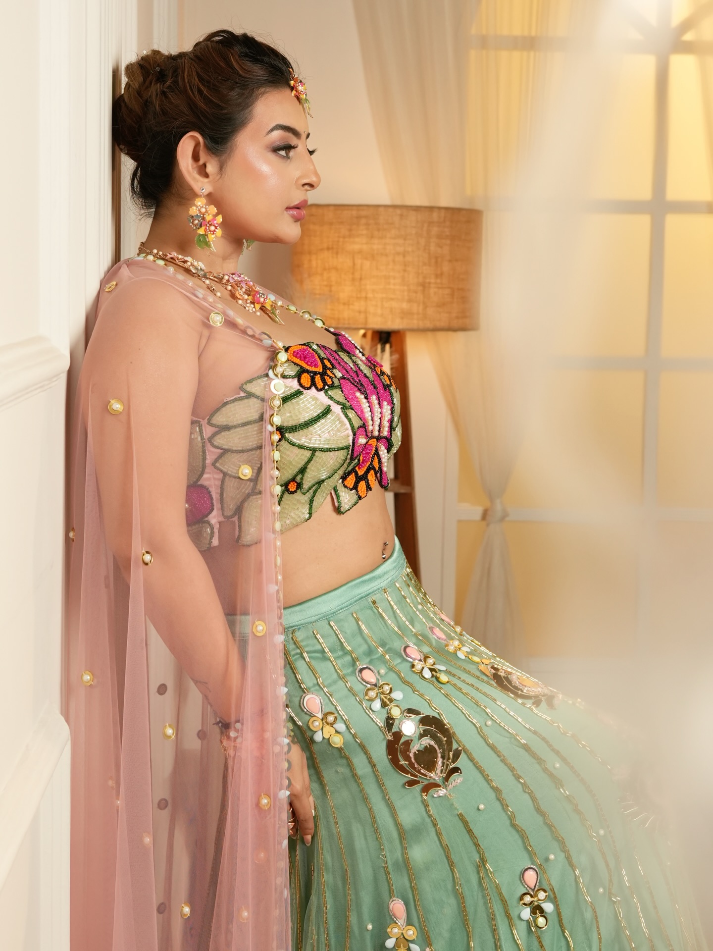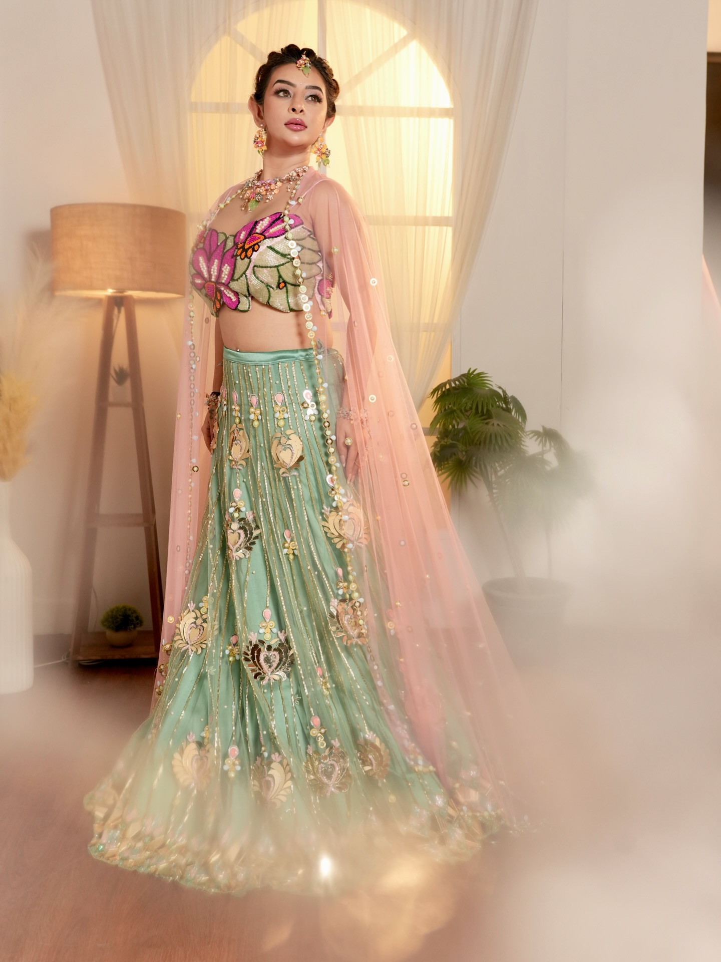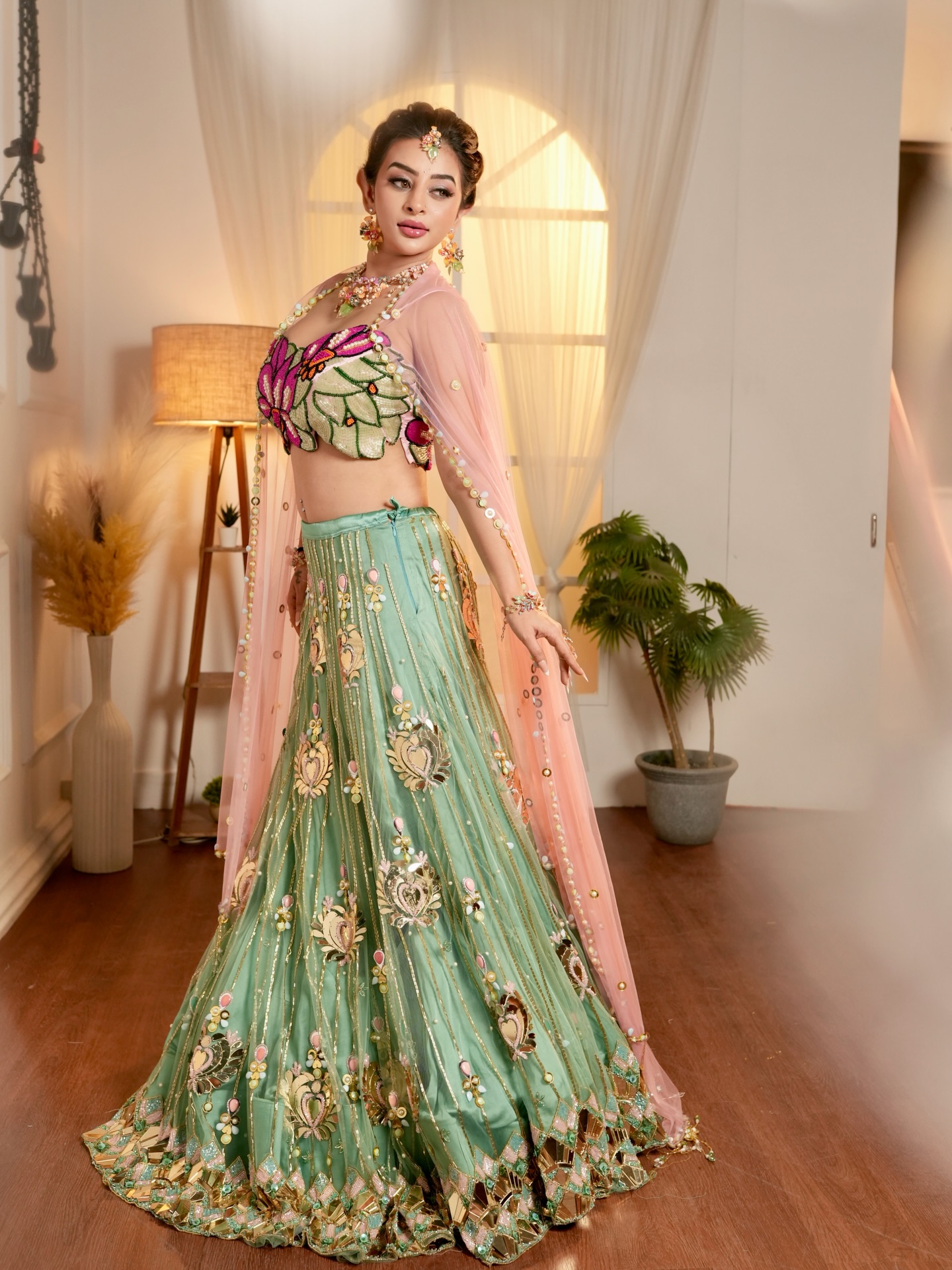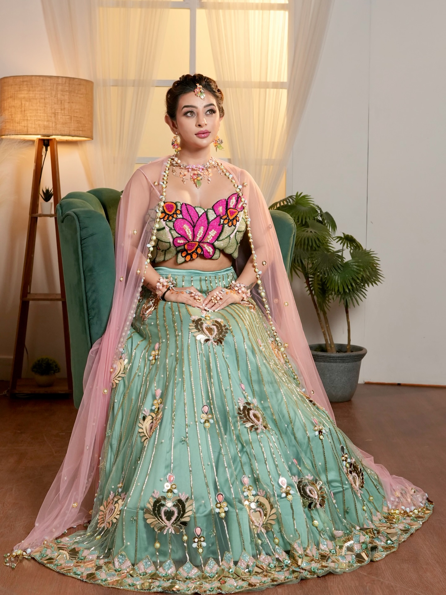In the photos, Ankita Dave is seen wearing a stunning mint green embroidered lehenga featuring intricate golden detailing and delicate floral designs. The outfit is paired with a beautifully crafted floral blouse with pink embroidery, giving the entire look a vibrant and eye-catching appearance.