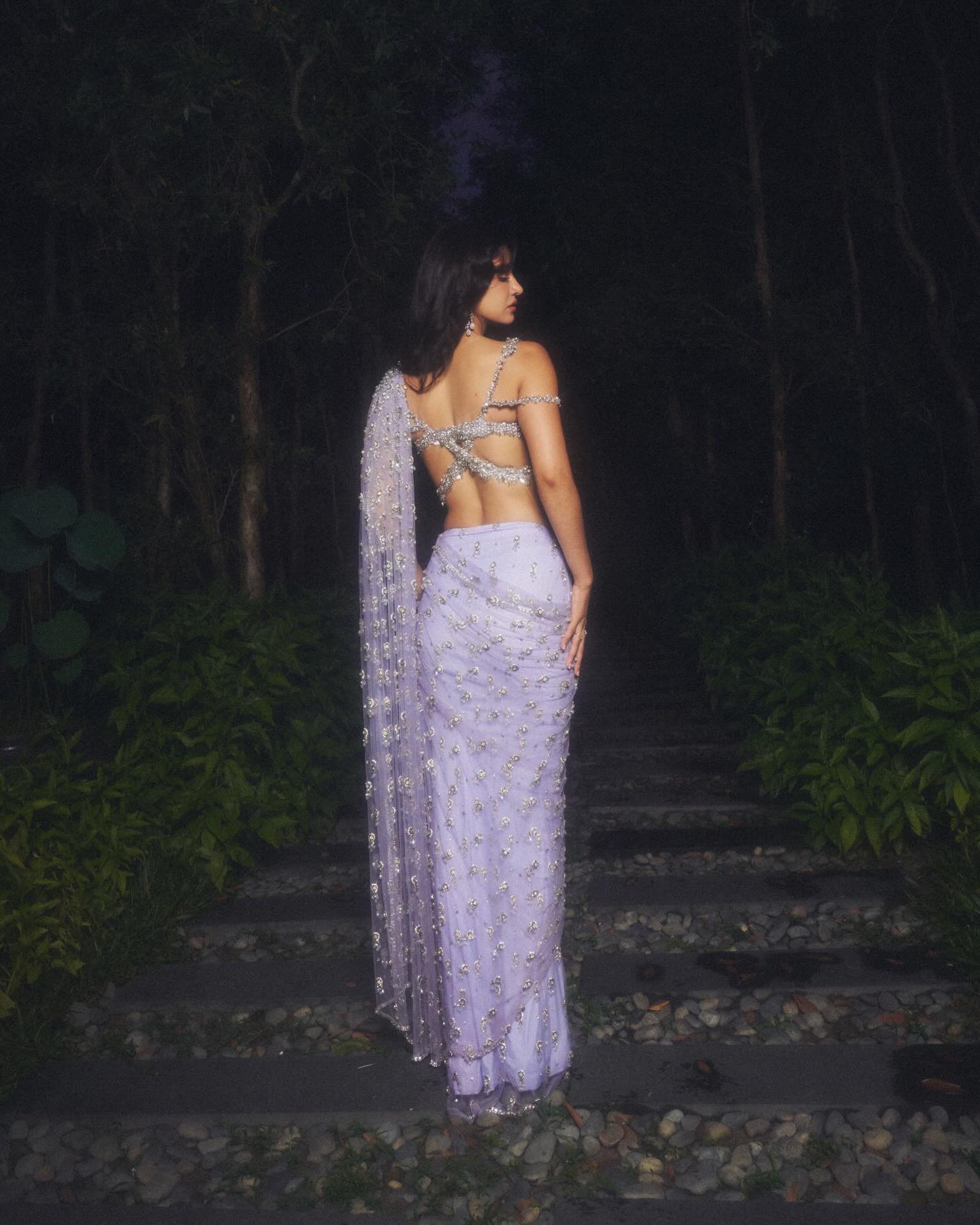 The saree drape flows softly across her shoulder and waist, creating a graceful silhouette. The fabric is light and semi-sheer, which adds a dreamy and fashionable feel to the photoshoot. The detailed beadwork and glittering embellishments catch the light perfectly, making the outfit stand out in every frame.