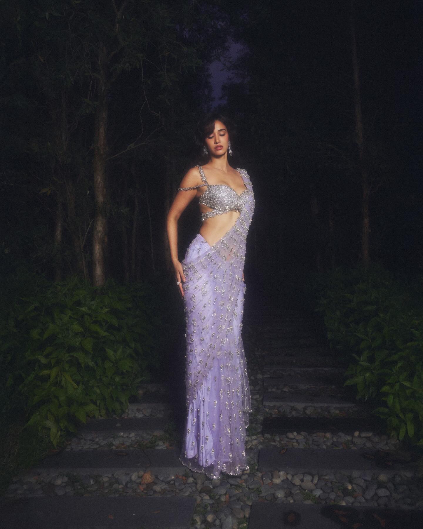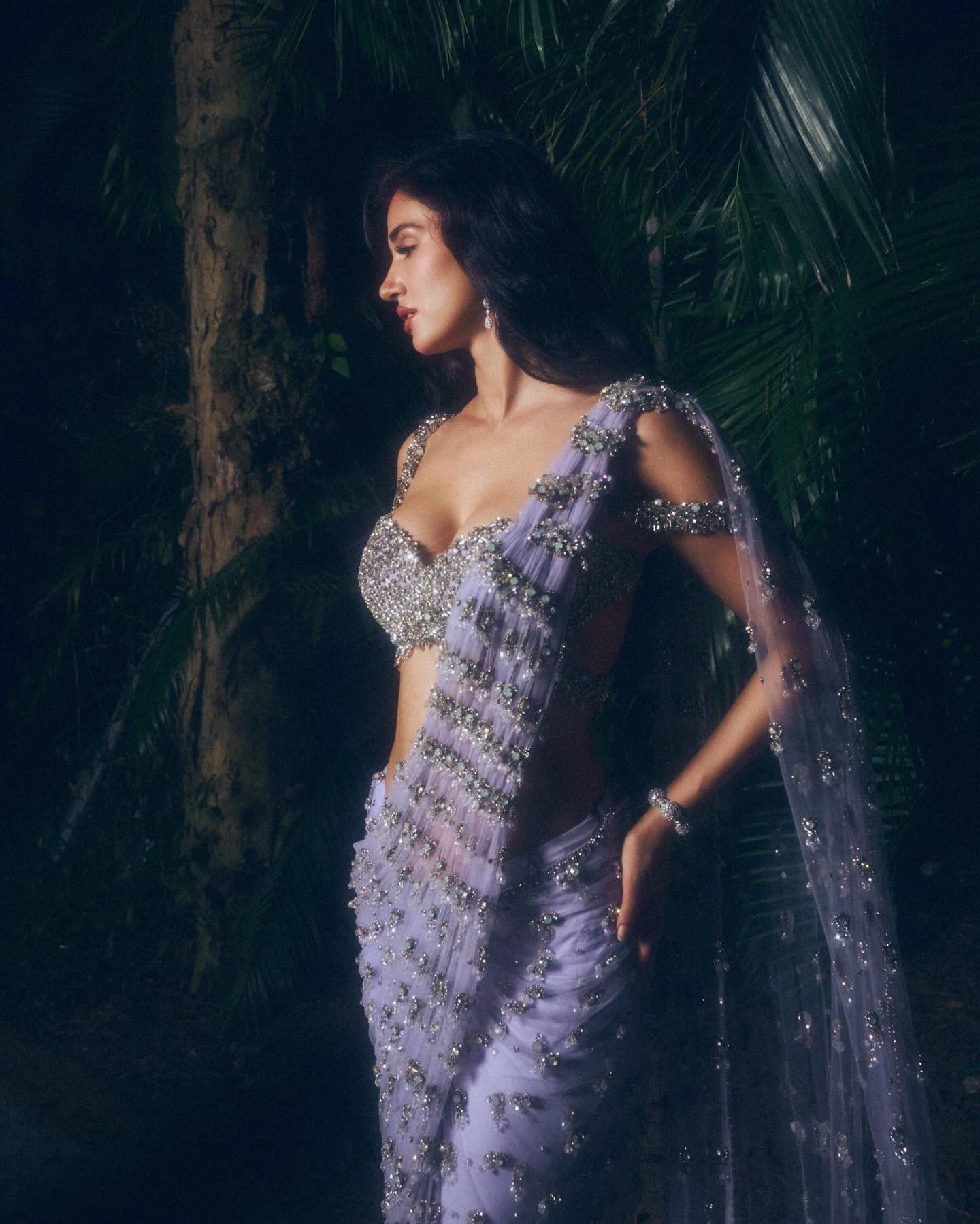 In these photos, Disha Patani is wearing a glamorous lavender-purple embellished saree style outfit that shines beautifully under the lights. The blouse is heavily decorated with silver crystal work and sparkling stones, giving it a luxurious designer look. The thin straps and detailed embroidery add elegance while keeping the style modern and bold.