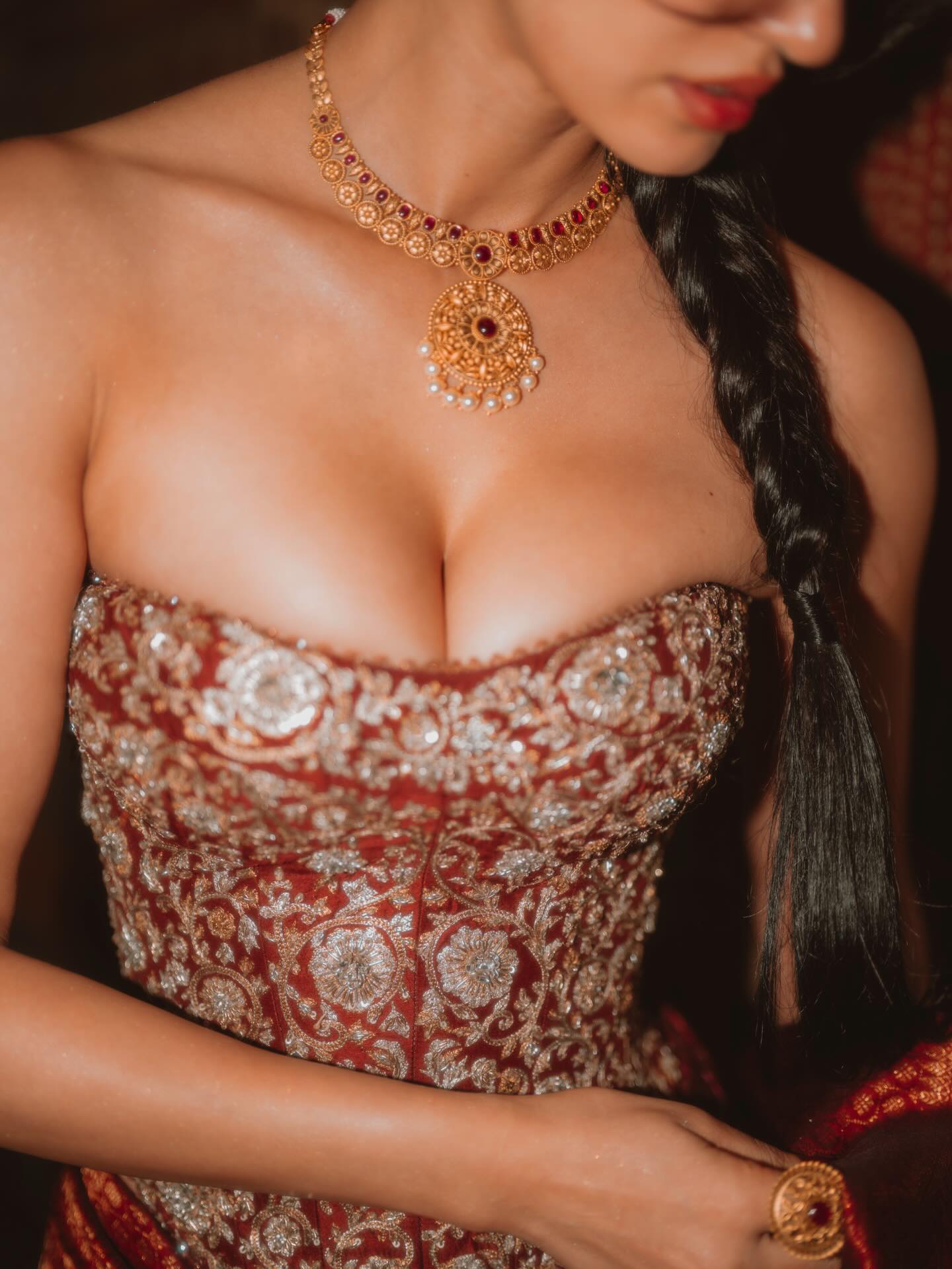 One of the most striking aspects of this photoshoot is Disha Patani’s stunning traditional outfit. She is seen wearing a deep red draped skirt paired with a heavily embroidered corset-style blouse. The golden embroidery and intricate patterns on the blouse add a luxurious and royal touch to the overall look.