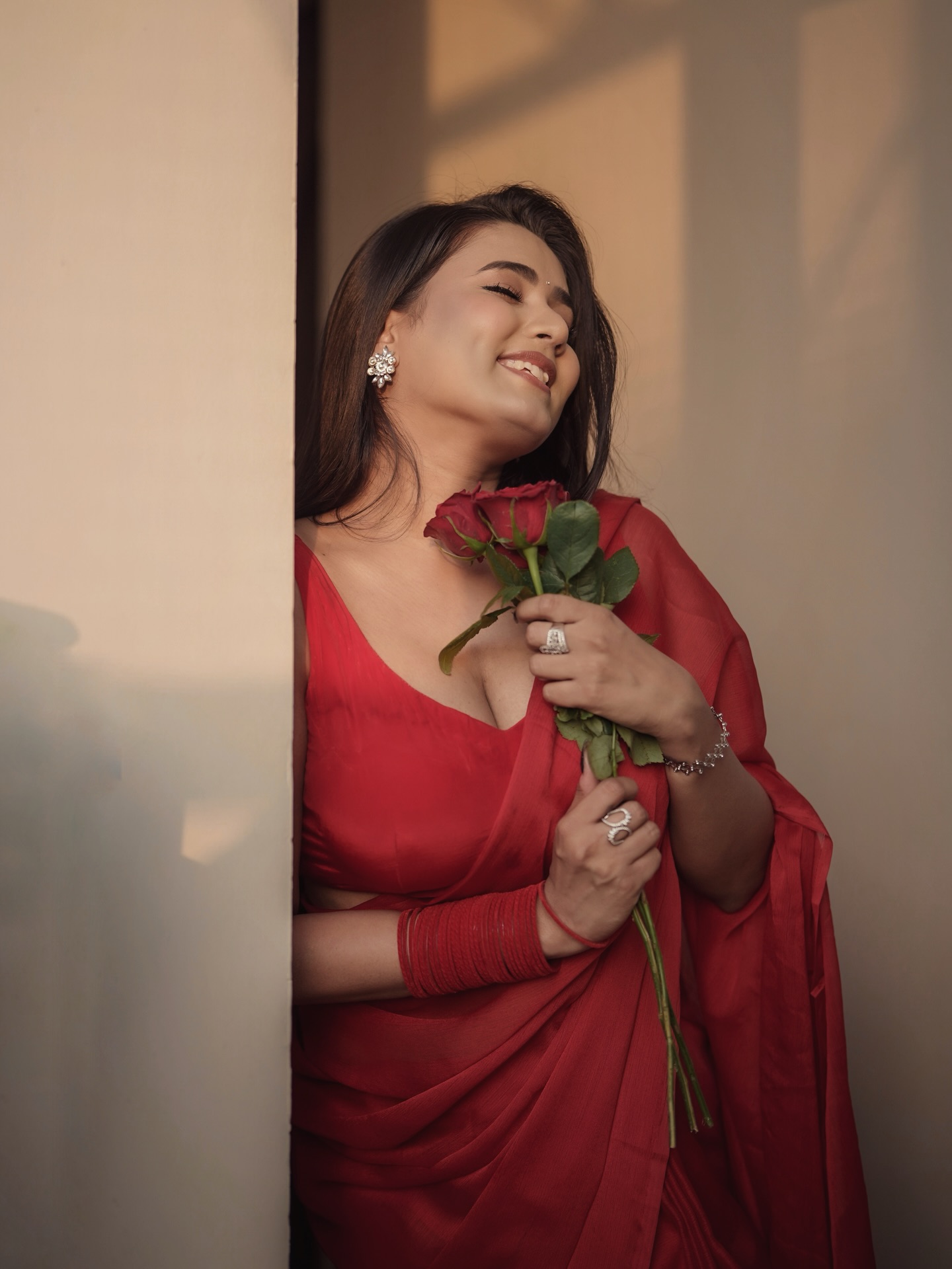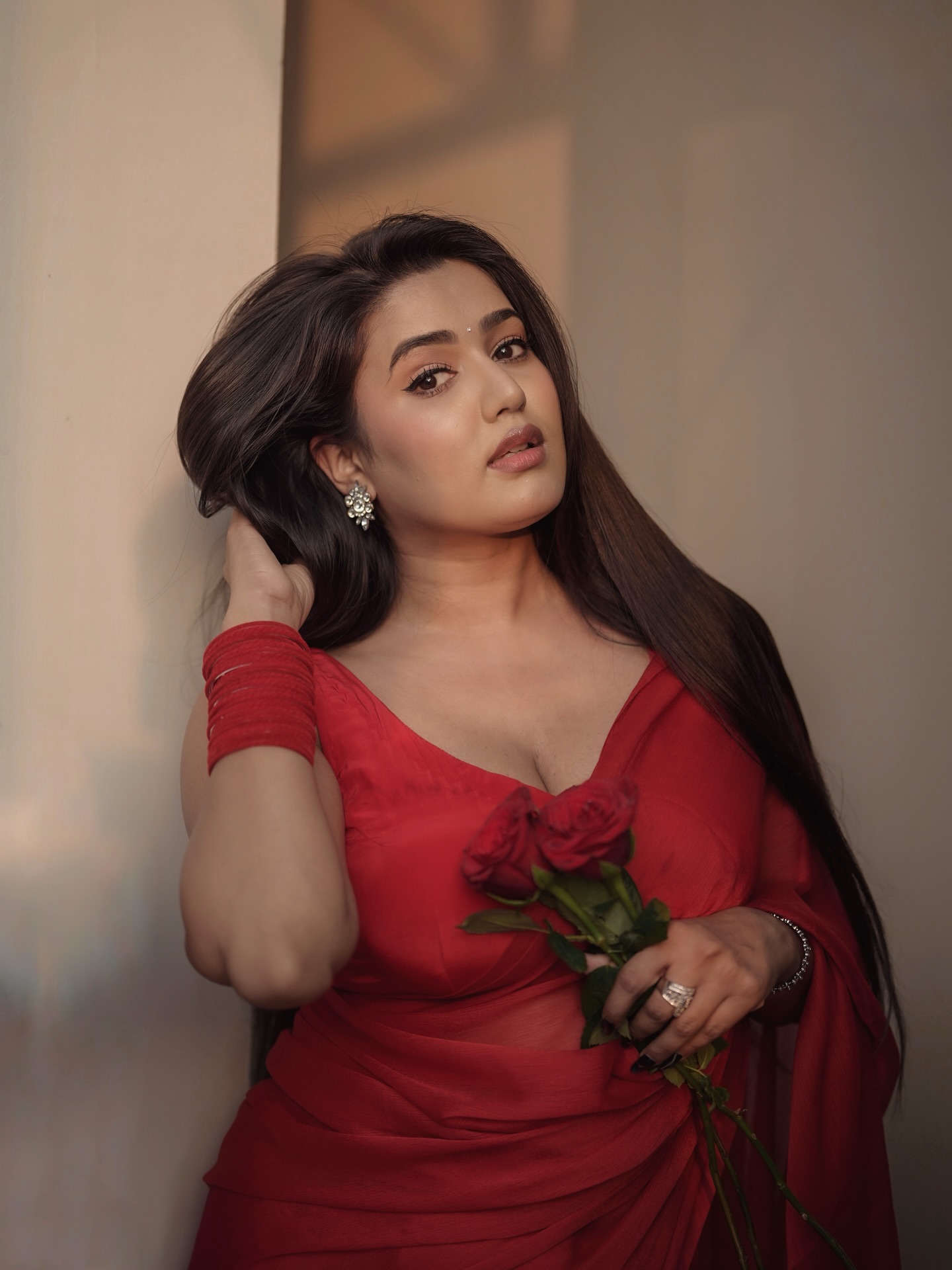This beautiful photoshoot of Garima Chaurasia in a red saree perfectly captures elegance, romance, and timeless Indian fashion. The combination of the vibrant saree, delicate accessories, and romantic red roses creates a visually stunning gallery.