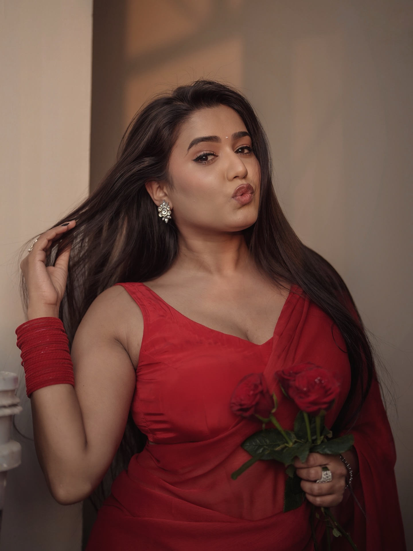 Popular Indian social media star and actress Garima Chaurasia continues to impress fans with her graceful beauty and stylish photoshoots. In this stunning gallery, Garima appears in an elegant red saree while holding beautiful red roses, creating a romantic and visually captivating look.