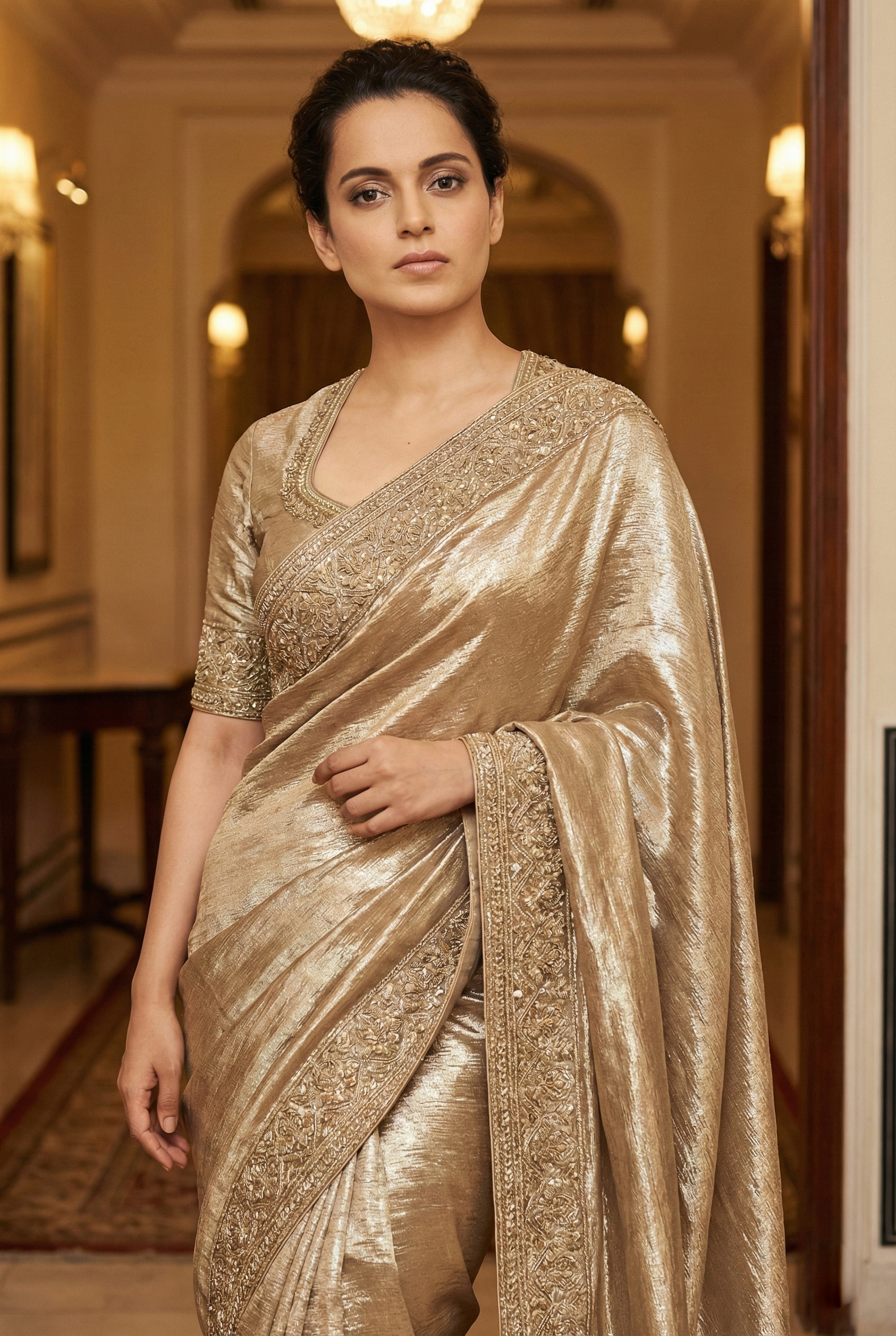 Ditching safe pastels and standard reds, Kangana embraced the Midas touch in a stunning metallic golden saree. Set against the warm, luxurious backdrop of a heritage hotel corridor, the look was nothing short of cinematic splendor.