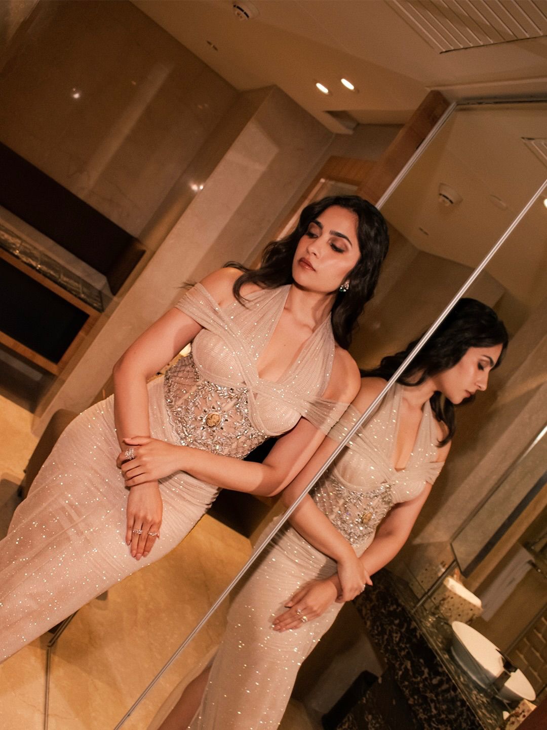 In the first look, Rukmini is seen wearing a shimmering beige-gold gown that hugs her silhouette perfectly. The off-shoulder design, combined with delicate embellishments, adds a luxurious feel to the outfit. Her pose against the mirror creates a visually striking composition, doubling the elegance and giving the image a premium editorial vibe. The warm indoor lighting enhances her skin tone and highlights the intricate details of her dress.