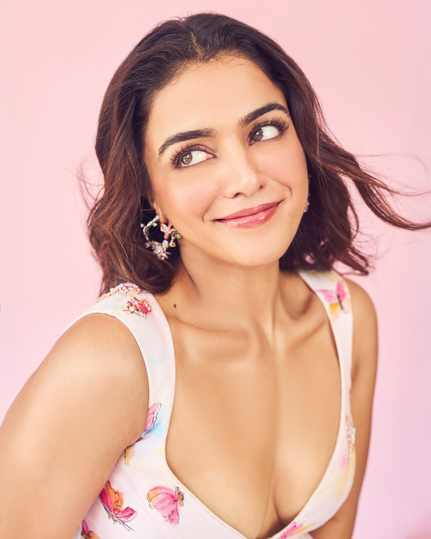 This beautiful photoshoot perfectly highlights the elegance and charm of Wamiqa Gabbi. The pastel butterfly floral lehenga, soft pink background, and her joyful expressions create a visually stunning image that captures attention instantly.
