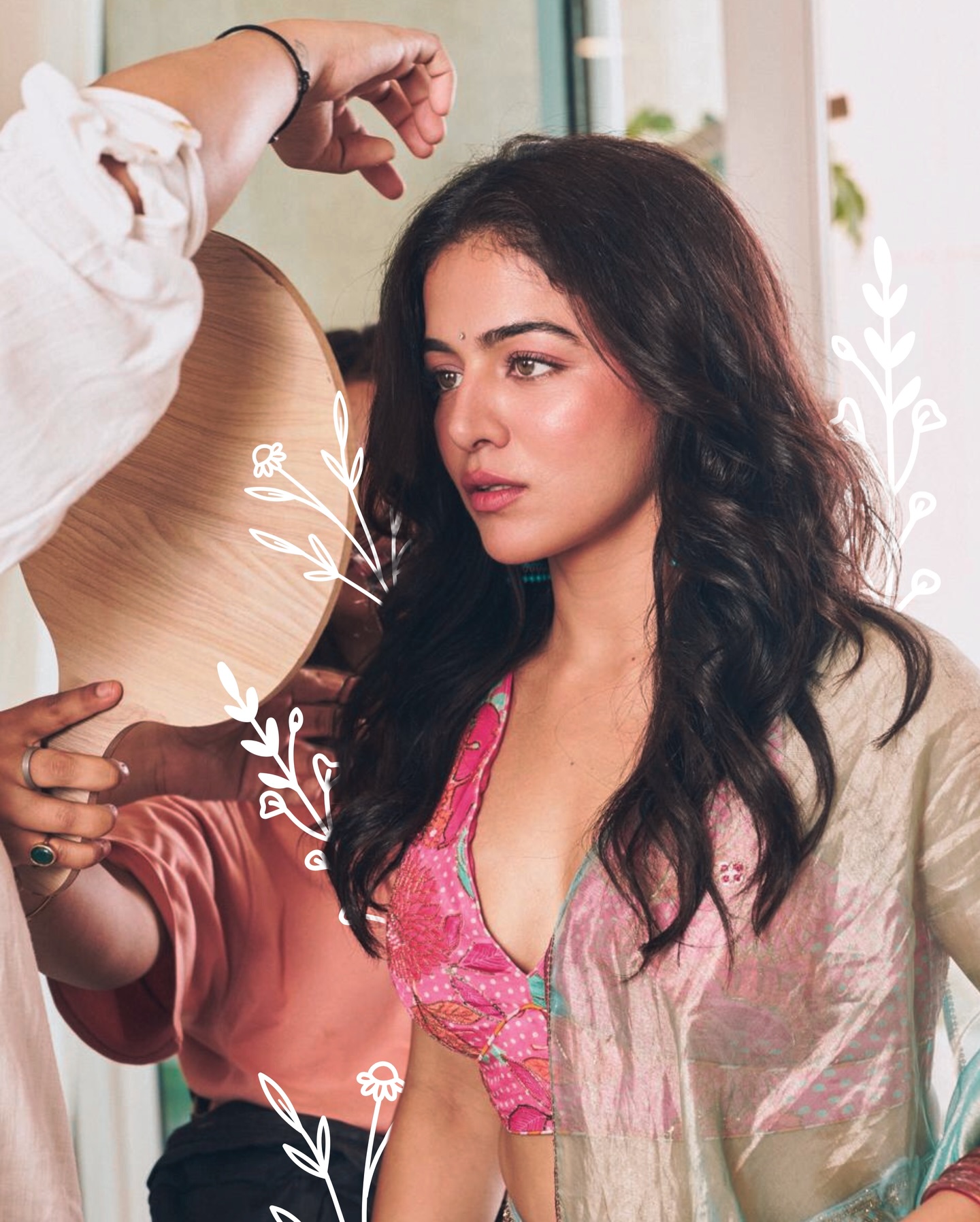 The third image is a close-up portrait that highlights Wamiqa’s expressive face and flawless makeup. She is seen gently touching her lips while looking sideways, creating a thoughtful and artistic pose. Her makeup is subtle and elegant, with soft pink tones that match the outfit perfectly. The small bindi on her forehead adds a traditional Indian touch, enhancing her graceful appearance.